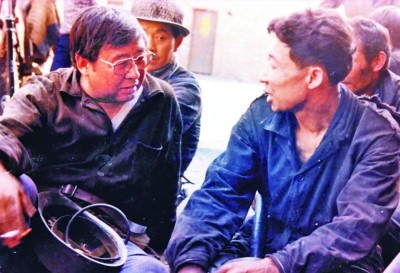 路遙(左一)在鴨口煤礦與礦工們交談。