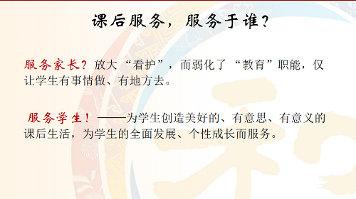 首先,學校管理者、教師都要明確:課后服務,到底服務于誰?如果定位為服務家長,只是解決家長接送難的問題,那么在開展課后服務時就會放大“看護”,而弱化“教育”職能。這顯然不是學校提供課后服務的根本目的,因此學校應準確定位于——服務學生,學校和老師才能努力為學生創造美好的、有意思、有意義的課后生活,為學生的全面發展、個性成長而服務。