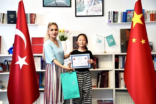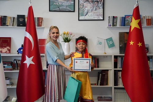 活動尾聲,蔣蘇為同學們頒發了榮譽證書,以表彰他們作為人文藝術小使者為中土民間外交所做出的努力。同時,蔣蘇也為同學們送上土耳其的特色禮物,并親切地和孩子們一一合影留念。海淀青少年活動中心的同學們也紛紛送上了各自準備的具有民族特色的禮物,還特地向因病在家休養的北京土耳其文化中心代理主任庫爾班先生表達了問候,并送上了一份由同學們共同制作的暖心禮物。