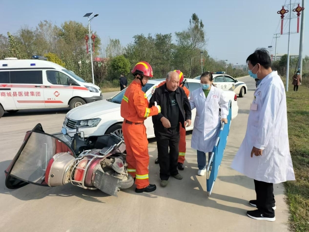 10月28日上午10時整,在接到當事人之一的電動車車主報警后,鎮派出所、消防隊第一時間趕赴現場,鎮應急、衛生部門人員隨后趕來。在現場,派出所民警立即對相關道路實行封閉管控,消防救援隊將受傷人員從轎車上解救下來并進行風險消除作業,隨后由衛生院醫護人員現場對傷者進行簡單的傷口處理,并將傷者及時送往醫院治療。