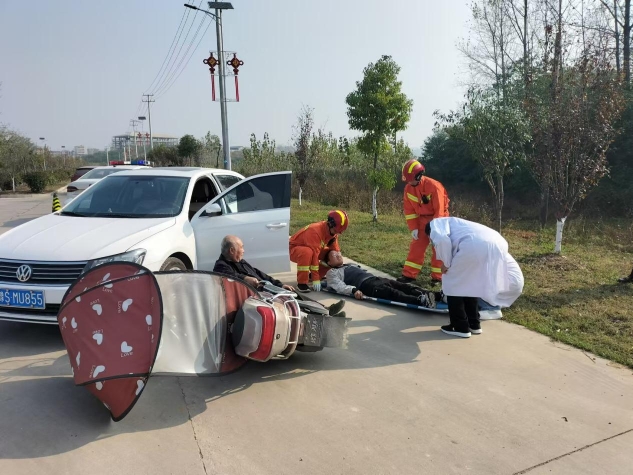 此次演練的背景:假設在該鎮楊寨社區東環路附近,模擬一輛小轎車與一輛電動車發生擦碰,小轎車剎車不及時與電動車擦碰后撞向了路邊的馬路牙子,導致小轎車駕駛員昏迷不醒,受傷嚴重。