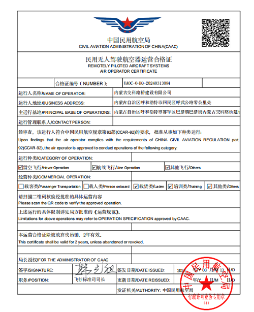 為深入貫徹落實自治區關于加快低空經濟高質量發展的工作部署,推動科技創新和產業創新融合發展,培育新質生產力,賦能高質量發展,近年來,內蒙古交通集團堅持頂層謀劃、頂格推進,加快布局低空經濟產業,全面搶抓發展先機,取得了《通用航空企業經營許可》《民用無人駕駛航空器運營合格證》資質證書。以“無人機采集信息數字孿生技術”為基礎,以全面提升生產效率,優化生產流程和管控方式,深挖“低空經濟+交通”產業高科技、高效能和高質量發展為目標,依托公路建設項目,不斷拓展應用場景,實現了無人機集成空天地協同智能巡檢、無人機現場安全巡查、無人機環境監測等多項關鍵技術的開發與應用,并取得了突破性的研究應用成果。
