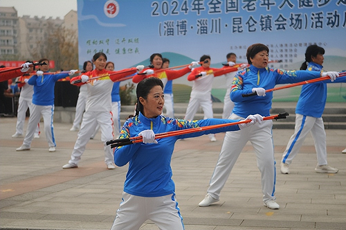11月10日,在山東省淄博市淄川區昆侖鎮舉行的2024年全國老年人健步走大聯動(淄博?淄川?昆侖鎮分會場)活動啟動儀式上,表演了手杖操、太極扇、舞龍等特色體育節目。(王隆濤 閆盛霆)