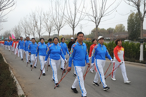 11月10日,山東省淄博市淄川區昆侖鎮老年持杖健走愛好者正沿著孝婦河路行進。