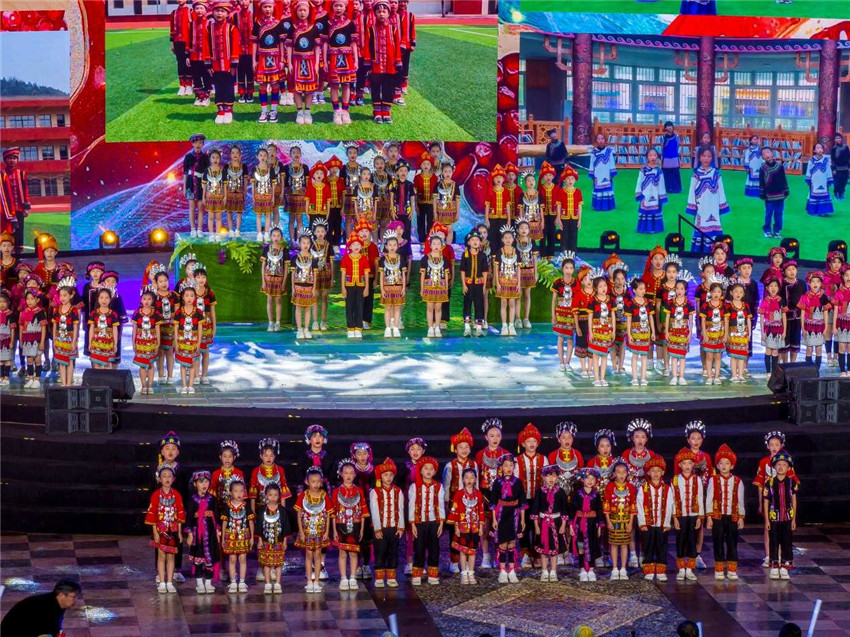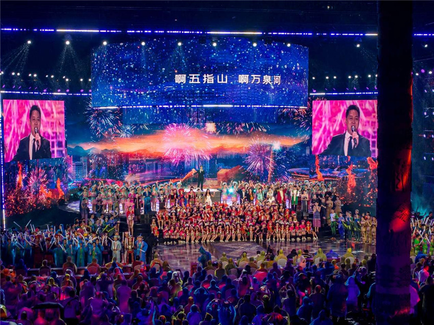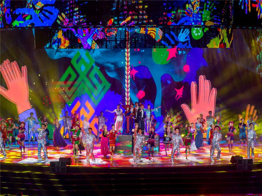 開幕儀式文藝演出在對黎族鉆木取火技藝的“情景演繹+燈光秀”中拉開序幕,分為“錦繡的承諾”“大地的呼喚”“雨林的回響”三個篇章,主要由情景走秀《千年織語》、童聲合唱《石榴籽之歌》、舞蹈《雨林茶香》、情景舞劇《站在海島中央》等節目組成。整場文藝演出通過聲光電等科技手段,全景式展現“鑄牢中華民族共同體意識共繪民族團結進步新畫卷”的活動主題,彰顯了海南多姿多彩的民族文化,將傳統與現代、民族與世界巧妙結合,全面展示了海南各族群眾勠力同心推進海南自貿港建設的精神風貌。最后,歌舞《久久不見久久見》將文藝演出帶入“終章——永恒的節日”。