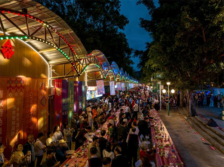 (3月31日,海南“三月三”,五指山市舉行的長桌宴。蔣聚榮攝)