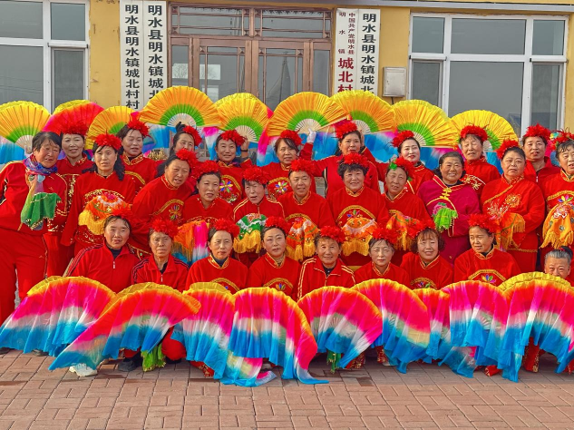 傍晚時分,黑龍江省綏化市明水縣明水鎮城北村文化活動廣場上震天的鑼鼓聲與歡笑聲交織成一片。三十多位婦女身著彩裝手中紅綢扇上下翻飛,紅綢飛舞如焰,舞步輕盈似蝶,廣場化作一片流動的彩霞。