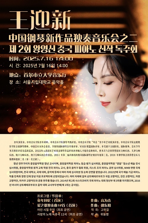 近日,一場別開生面的“王迎新中國鋼琴新作品音樂會之二”在韓國首爾市立大學音樂廳華麗上演,為中韓音樂文化交流添上了濃墨重彩的一筆。此次音樂會由青年演奏家、中央音樂學院青年講師王迎新擔綱,她以精湛技藝和對中國新作品的深刻理解,為韓國觀眾打開了一扇了解中國當代鋼琴音樂的大門。
